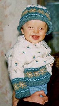 По вертикальным краям полочек набрать по 69 (81/93)п. голубой, соотв. желтой, нитью и вязать 2 см резинкой.