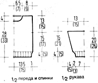 Перед: вязать аналогично, но после резинки вывязать жаккардовый узор. Кроме того, выполнить вырез горловины. Для этого через 24 см = 54 р. (28 см = 62 р.) от резинки закрыть средние 7 (8) п. и закончить обе стороны раздельно. Для закругления закрыть в каждом 2-м р. 1 раз 3 п., 1 раз 2 п. и 2 раза по 1 п. Оставшиеся 15 (17) п. плеча закрыть с обеих сторон на той же высоте, что и на спинке.