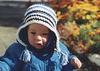 Так же вяжем внешнюю часть ушка, но 1-й ряд выполняем за внутреннюю полупетлю петель основания. Между ушками сзади оставляем 10 петель, спереди - 20. Всю шапочку вместе с внешними ушками обвязываем ст. б/н: 1-й ряд - белой нитью, 2-й ряд - темно-синей. На белом фоне можно сделать вышивку крестом.
