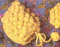 Сборка: Части изделия сшить. Нижнюю кромку шапочки обвязать1 р. ст б/н и 1 р. ст. с/н. В ряд, связанный ст. с/н, продернуть шнурок длиной 70 см и прикрепить помпоны.