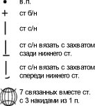 Узор "шишечки": вязать за пластическим узором. Из петли основания ст с/н вывязать 7 ст с тремя накимдами, оставив последнюю петлю каждого ст на крючке. Затем провязать п. вместе. Повторять раппорт между стрелками. Плотность вязания: 13 п. х 18 р. = 10 см.