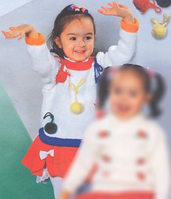 Материалы: 300 г белой пряжи, 20 г синей, по 10 г желтой, оранжевой, зеленой. Спицы № 3 и № 2,5.