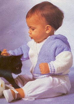 Капюшон: на спицы № 3 набрать 87 (91) п. голубой нитью и вязать резинкой 3 см. Продолжить спицами № 3,5 изн. гладью. Через11(12) после резинки закрыть для задних скосов капюшона с обеих сторон в каждом 2-м р. 3 раза по 12 п. Оставшиеся 15 (19) п. закрыть в одном ряду.