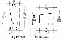 Сборка: детали наколоть на выкройку, увлажнить и дать им высохнуть. Выполнить швы. Боковые швы оставить вверху для пройм на 13 (14) см открытыми. Выполнить задний шов капюшона. Пришить капюшон к горловине, слегка присборив. Вшить молнию. Вшить рукава.