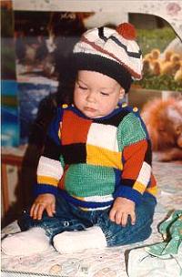Вам потребуется: ок. 40 г зеленой пряжи (51% хлопка, 49% полиакрила, 50 г = 120 м), 40 г красной, 40 г желтой, 40 г синей, 30 г черной и 30 г белой пряжи; спицы 2,5.