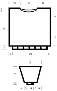 Перед и спинка: набрать нитью синего цвета по 76 п (28 см). Вязать резинкой 10 р. (3 см). продолжить вязание "лоскутками". Горловина переда и горловина спинки показаны на чертеже.