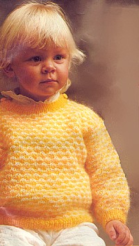 Сборка: детали наколоть на выкройку, увлажнить и дать им высохнуть. Выполнить швы. Боковые швы оставить для пройм вверху на 13 (14) см открытыми. Набрать на спицы № 3 желтой нитью ок. 41 п. по краю горловины спинки и по 1,5 см с обеих сторон от них по краям горловины переда и вязать для бейки горловины спинки резинкой 2 см в прямом и обратном направлениях. Затем закрыть все петли по рисунку. Набрать на спицы № 3 желтой нитью ок. 51 п. по краю горловины переда и с обеих сторон от них по 1,5 см по краям горловины спинки и вязать для бейки горловины переда резинкой в прямом и обратном направлениях.. Во 2- м р. бейки (= лиц. р.) для 2 отверстий для пуговиц закрыть с обеих сторон 4-ю и 5-ю, соответственно 5-ю и 4-ю от конца петли и вновь набрать их в следующем ряду. На высоте бейки 2 см закрыть все петли по рисунку. Пришить пуговицы. Вшить рукава.