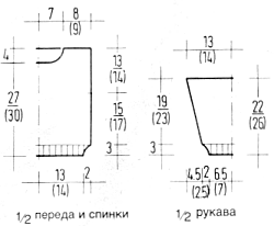 Перед: вязать аналогично, но с горловиной. Для этого через 24 (27) см от резинки закрыть средние 10 п. и закончить обе стороны раздельно. Для закругления закрыть в каждом 2-м р. 1 раз 3 п., 2 раза по 2 п. и 3 раза по 1 п. Оставшиеся 19 (21) п. плеча закрыть на той же высоте, что и на спинке.