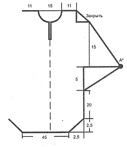 Спинка: набрать на спицы 81 п., вязать рисунком по схеме 1, прибавив 5 раз в каждом 2-м р. по 1 п. с каждой стороны. Далее вязать прямо 50 р., затем прибавить 10 раз по 2 п. в каждом 2-м р. с двух сторон, вывязывая из одной петли 3 п. до точки А. Далее убавлять с двух сторон по 1 п. в каждом лицевом ряду, провязывая по 2 п. вместе после кромочной – 40 р. Вывязать закругление плеча – закрыть 2 раза по 2 п., 2 раза по 3 п., 1 раз – 4 п. Закрыть плечи – по 23 п. Петли горловины оставить открытыми.