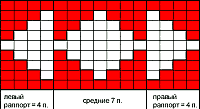Затем вязать 9 р. жаккардовым узором: кром., 4-я п. (со 2-й по 4-ю п./4-я п.) правого раппорта, 9 раз (10 раз/12 раз) правый раппорт, средние 7 п, 9 раз (10 раз/12 раз) левый раппорт и 1-я п. (с 1-й по 3-ю п./1-я п.) левого раппорта, кром. Далее вязать лицевой гладью белой нитью.