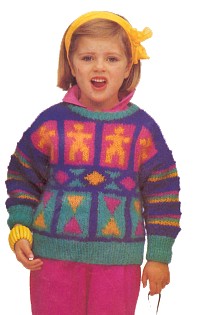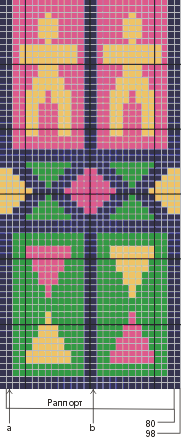 Последовательность полос: * 6 р. лиц. глади и 2 р. платочной вязки темно-синей нитью, по 2 р. лиц. глади темно-желтой, зеленой и ярко-розовой нитью, 2 р. платочной вязки темно-синей нитью, повторять от *.