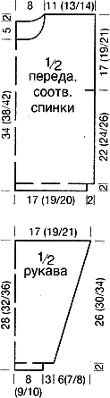 Перед: Вязать, как спинку. На высоте 34 (38/42) см закрыть для горловины средние 14 п.,
