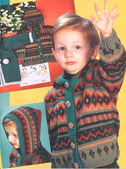 Капюшон: набрать 124 п. на спицы № 3, провязать 2 см резинкой 1х1, перейти на спицы № 4, вязать по схеме, через 14 см от начала детали закрыть по 10 п. с обеих сторон, 2 раза по 10 п. в каждом 2-м р., 1 раз по 8 п. во 2-м р. Затем вязать среднюю часть капюшона = 32 п., закрывая с 2-х сторон по 1 п. 2 раза в каждом 4-м р. и 6 раз в каждом 7 р., оставшиеся 16 п. закрыть.