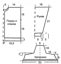 Сборка: соединить детали капюшона, выполнить плечевые швы, соединить капюшон с горловиной. Вшить рукава, выполнить боковые швы и швы рукавов. Пришить пуговицы.