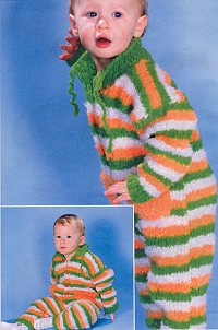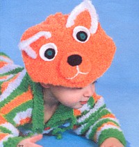 Материалы: по 100 г буклированной пряжи зеленого, оранжевого и белого цвета, немного черной и белой для отделки (ORLIS FUNNY), спицы № 4,5; крючок № 3 (фирмы PONY).