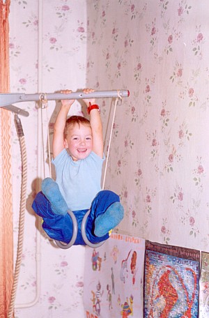 Вернулись от бабушки, ребенок так соскучился по своим кольцам, что немедленно на них залез и стал изображать из себя парашютиста и вообще, экстримщика.